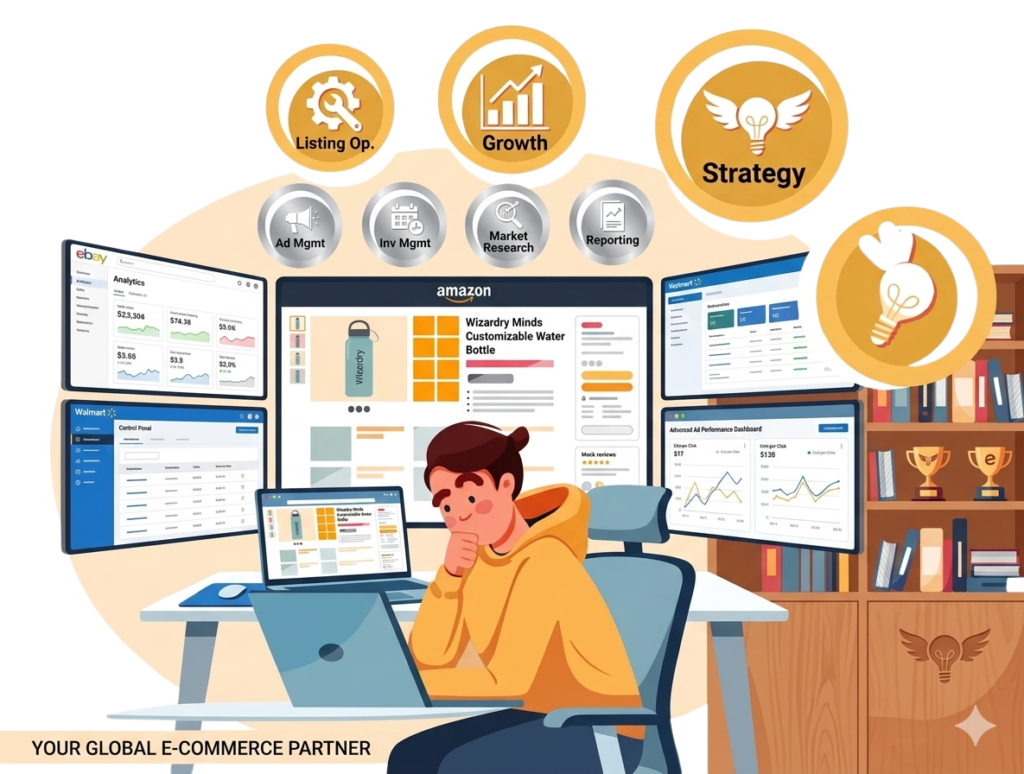 Amazon account management is the full-service management of an Amazon seller account by a specialist agency, covering product listings, PPC advertising, customer service, account health monitoring, and growth strategy. Urtasker’s Amazon account management service handles every aspect of your seller account so you can focus on sourcing and scaling your business.